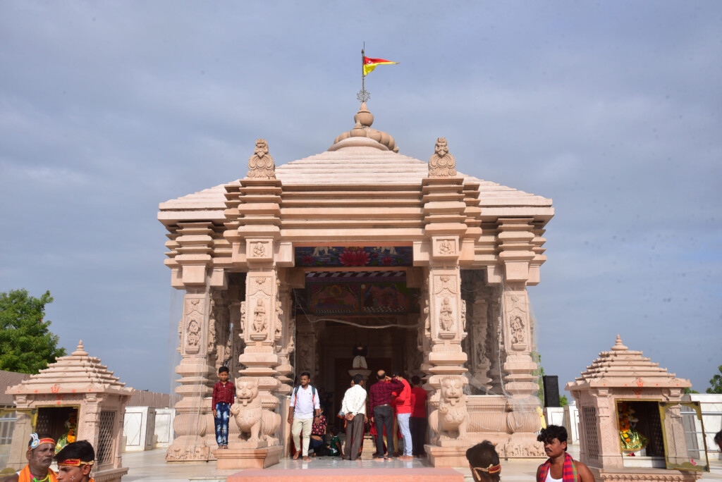 The temple’s architecture is a breathtaking sight — its towering shikhars (spires) and intricate carvings echo the traditional Kalinga style of temple design seen in Odisha. Every stone speaks of fine craftsmanship and devotion. With its ivory-hued façade gleaming under the bright blue skies, the temple creates an aura of purity and grandeur.